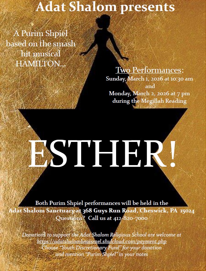 Donations to support the Adat Shalom Religious School are welcome at the link below. Choose “Youth Discretionary Fund” for your donation and mention “Purim Shpiel” or “Purim Carnival” in your notes